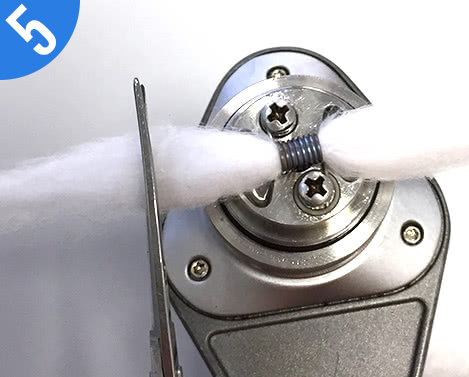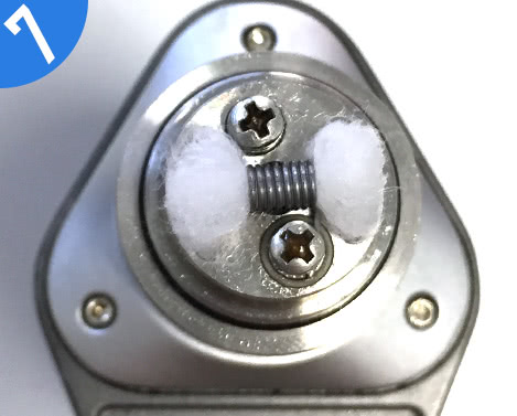 Das Befeuchten der Watte: Gebt ein paar Tropfen eures Lieblingsliquids auf die Wicklung und die Watte. Nun könnt ihr eure Watte noch in die perfekte Lage modellieren – Fertig!