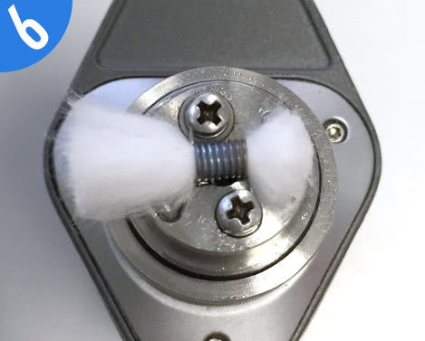 Legt die Watte locker in die Kanäle, so dass der ganze Kanal mit Watte ausgefüllt ist (nicht stopfen, sonst bekommt ihr einen Liquidabriss).